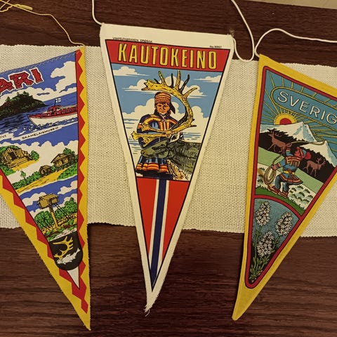 Lappi Lappland viiri, jossa on porosiluetti ja värikäs auringonlaskumaisema. Kolmionmuotoinen kangasviiri, jossa tekstiä suomeksi ja englanniksi. Sopii esimerkiksi matkamuistoksi, sisustuselementiksi tai keräilyesineeksi Lapin aiheisista tuotteista kiinnostuneelle. Pituus 26 cm.