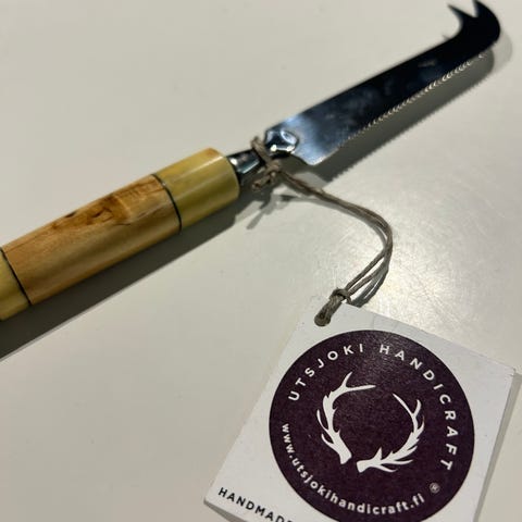 Luonnosta valmistetussa poronsarvesta on monimutkaisia vuoristo- ja luontoaiheita, jotka on kaiverrettu käsin klassiseen lappilaiseen tyyliin. Täydellinen yhdistelmä toiminnallisuutta ja taiteellisuutta, tämä ainutlaatuinen teos ilmentää Pohjois-Suomen perintöä ja käsityötaitoa.