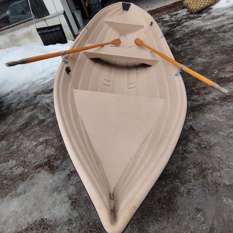 Valkea yki 420. Uusi. Airot ja nivelhankaimet vielä paketissa. Luovutus paperit tehdään.