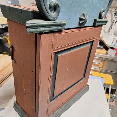 Puurunkoinen siro rahi, jossa suorakaiteen muotoinen, irrotettava istuinosa. Istuimessa on pehmuste ja kangasverhoilu, jossa on vaalean ja sinisen sävyiset raidat. Jaloissa on sorvatut yksityiskohdat ja helmenharmaa pellavaöljymaali.