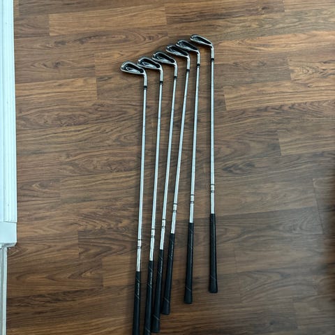 Wilson Pro Staff FT -rautamailasetti grafiittivarsilla 5, 6, L ja 9 ja P-wedge Wilson Stretch True Temper teräs varrella. Mailoissa siistit ehyet kumigripit.