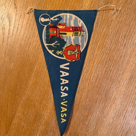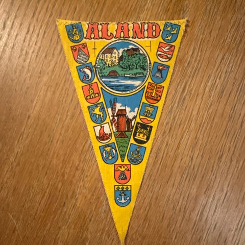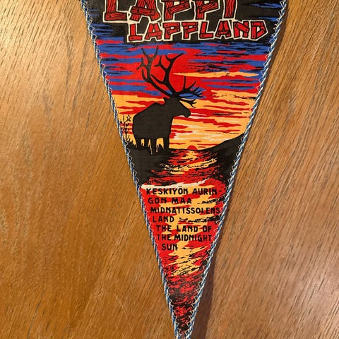 Korkeasaari Högholmen viirinauha, jossa kolmionmuotoinen kangasosa. Etupuolella värikäs eläinaiheinen kuvitus, jossa muun muassa leijona, karhu, jääkarhu, apina ja lintu sekä teksti Korkeasaari Högholmen. Reunoissa keltainen reunus ja yläreunassa naru ripustamista varten. Sopii esimerkiksi sisustuselementiksi tai kokoelmaan liittyväksi esineeksi. Vanha. Korkeus 15 cm