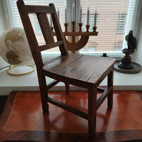 Puutuoli koristekaiverretulla selkänojalla ja nahkaistuimella