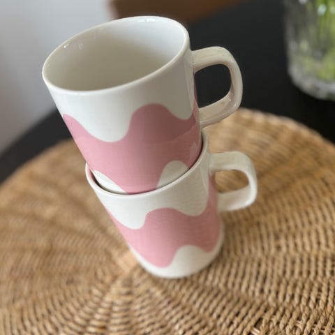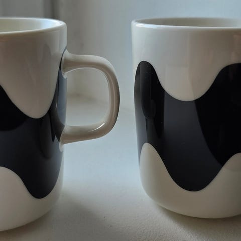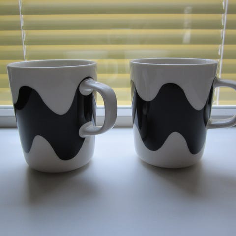 Marimekko Oiva Lokki muki mustavalkoinen. Keraaminen muki, jossa on mustavalkoinen aaltoileva Lokki-kuvio. Mukit on 4dl iso ja täysin käyttämättömät. Astia on kuvien ja pohjamerkintöjen perusteella uunin-, mikron- ja konepesun kestävä.