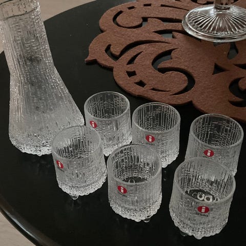 Snapsilasi, jälkiruokakulho ja n. 20 cm tarjoilukulho. Nouto tai postikulut lisätään hintaan.