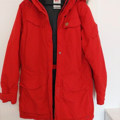 Fjällräven naisten talvitakki, koko M. Pitkä, musta untuvatakki, jossa tikattu rakenne ja lämmin toppaus. Takissa on kiinteä huppu kiristysnyöreillä, etuvetoketju ja nepparikiinnitys. Edessä suuret läppätaskut ja sisäpuolella tasku. Hihansuissa on joustavat resorit. Soveltuu kylmiin talviolosuhteisiin ja arkikäyttöön.