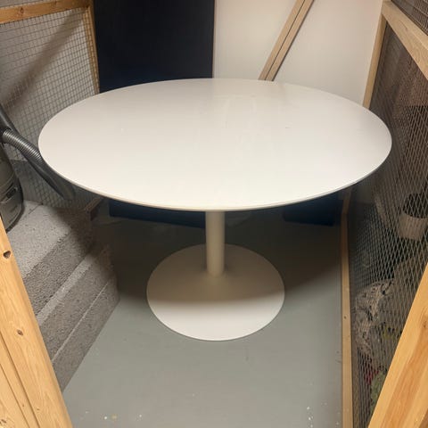 Pöydässä pientä kulumaa ja pieni kupru, näkyy kuvissa