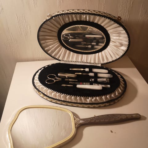 Upea setti vuosikymmenten takaa keräilijälle. Setissä puuteri, luomiväri, huulipuna ja ripsiväri. Puuteria lienee kokeiltu vipasta päätellen, mutta esim. suojamuovi on vielä paikallaan.
