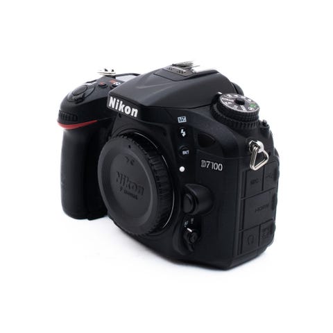 Nikon D7100 digitaalikamera kuvissa näkyvin objektiiveineen ja tarvikkeineen. Kameran suljinlukema 710. Vaihto johonkin järkevään mahdollinen.