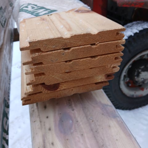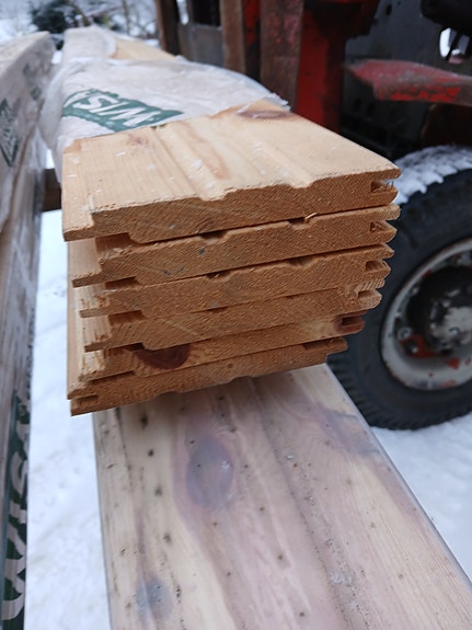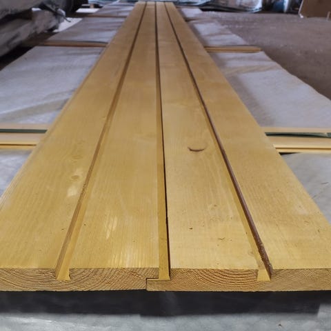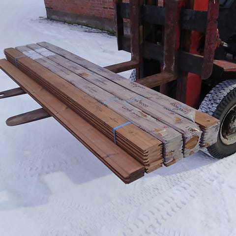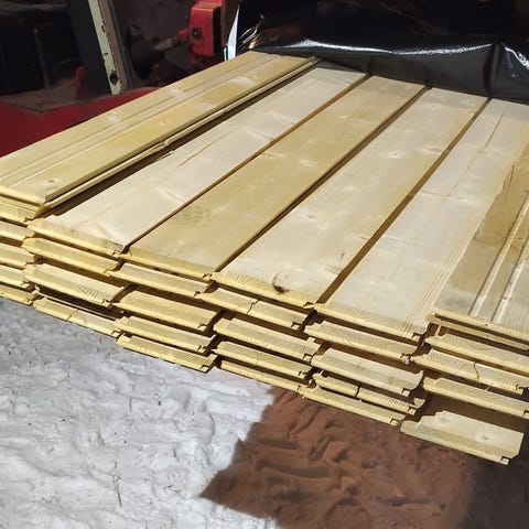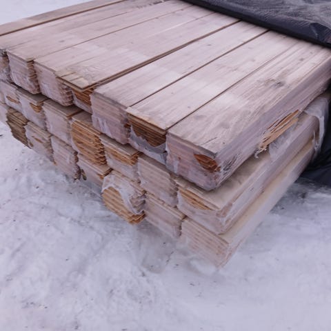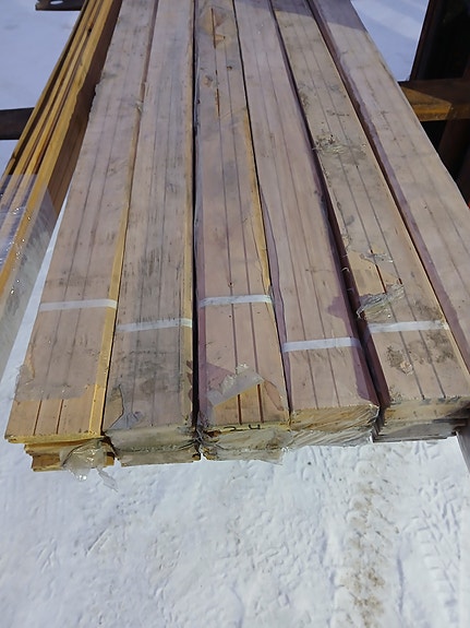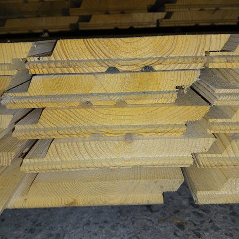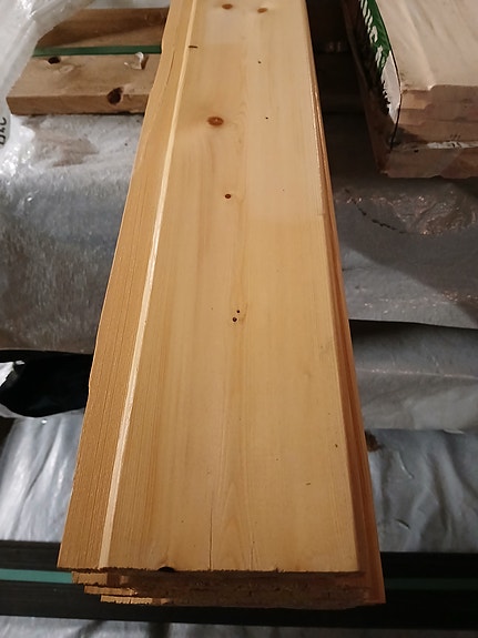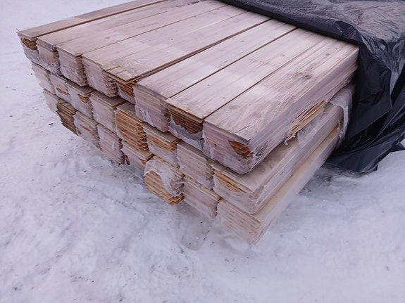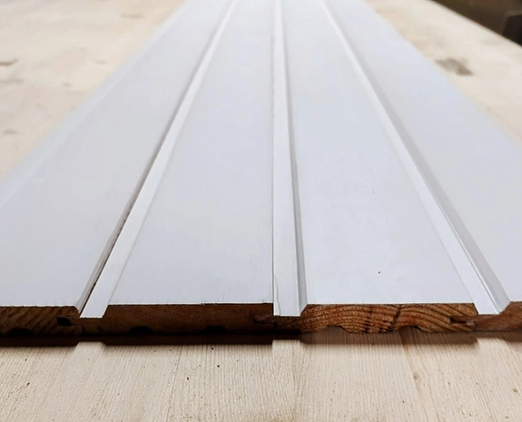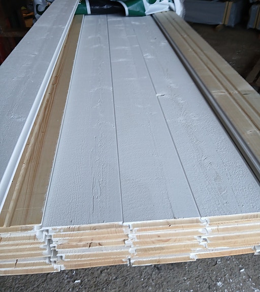 Valkoiseksi pohjamaalattua ulkoverhoupaneelia. Ainakin päällikerros pölyinen/likainen, mutta tämä erä alle kympin neliö. Suurin osa paneeleista päätypontattua.
