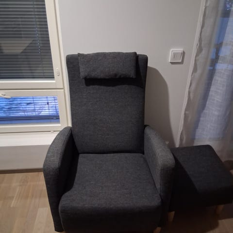 Keinonahkainen musta lepotuoli jalkatuella. Tuolissa on korkea selkänoja ja pehmustetut käsinojat. Istuinosasta avautuu integroitu jalkatuki, joka tukee jalkoja istuttaessa tai puolimakuuasennossa. Sopii olohuoneeseen tai muuhun oleskelutilaan istuma- ja lepohetkiin. Tästä hyväkuntoinen mekananismi nojatuoli uuteen kotiin, tee tarjous!