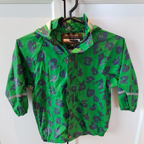 Hyväkuntoinen sadetakki, koko 98. Sininen, jossa autokuvioita. Vuori valkoinen.