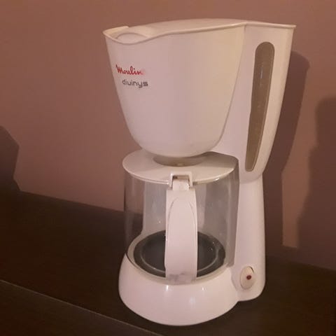 Wilfa kahvinkeitin. Ei ole parhaassa kunnossa, mutta kyllä tuolla kahvit hyvin keittää. Itse olen pessyt useampaan kertaan. En tiedä onko tuossa suuttimessa kalkkia ja ruostetta, saattaisi lähteä hinkkaamalla pois, itse en ole jaksanut. Kahvipannun alusta hieman kulunut, mutta en ole huomannut vaikutusta käyttöön.