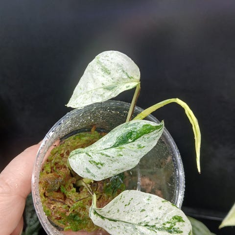 Upea kultaköynnös-laji, Sunburst varsipistokas liuskalehdellä, juurella sekä kahdella uudella kasvupisteellä. Istutettu nyt sammaleeseen.
