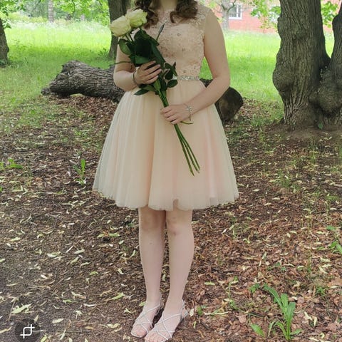 Rippimekoksi ostettu kaunis vaalea mekko.