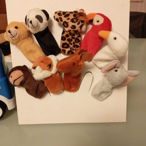IKEA sorminuket, eläinhahmoiset kangaslelut. Setissä kolme sorminukkea: pupu, pöllö ja kettu.