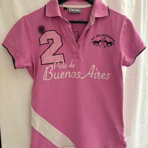 Myydään HV Polo pusero, väri ruskea jossa pinkki koristeet.