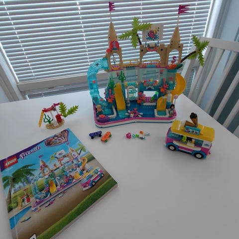 LEGO Friends huvipuistosetti. Rakennussarjassa on useita värikkäitä osia, kuten vesiliukumäki, vuoristorata ja erilaisia huvipuistolaitteita. Mukana on useita mininukkeja ja pieniä lisäosia roolileikkeihin. Sopii LEGO Friends -teemasta pitäville lapsille ja kokoajille, jotka haluavat rakentaa ja leikkiä huvipuistoympäristössä.