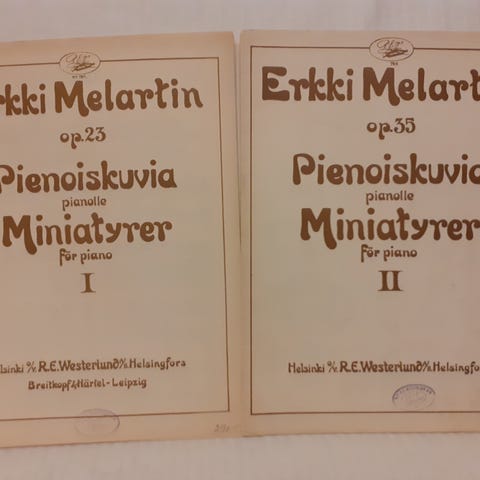 Nuottivihkot, joissa suomalaisten säveltäjien pianomusiikkia. Mukana mm. Jean Sibeliuksen Pelleas & Melisande 4 kädelle, Andantino op. 24 nro 7 pianolle, Toivo Kuulan sävellyksiä pianolle, Erkki Melartinin ja Oskar Merikannon pianokappaleita sekä Herman Sjöblomin teos “Syysruusuja – Höstrosor” op. 4. Nuotit on painettu R. E. Westerlundin kustantamina. Sopii pianonsoittoon tai kokoelmakäyttöön. Olleet Päivi Paunun omistuksessa.