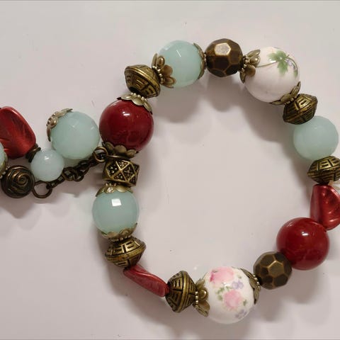 Uusi itsetehty spiraalimainen rannekoru. Erilaisia Violetteja ja hopean värisiä kiviä ja metallisia helmiä.