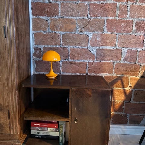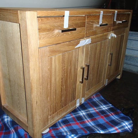 Mitat kuvissa. Kunto muuten hyvä mutta kannessa tahra. Toisen liukuoven takaa puuttuu hyllylevy. Sijaitsee Lausteella.