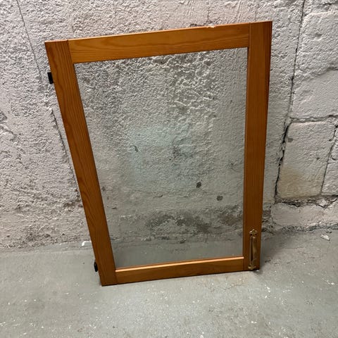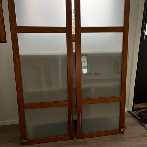 Annetaan kaksi Lundia TV-tason ovea maitolasilla. Leveys 48, 8 cm, korkeus 40 cm. Alkuperäiset saranat.