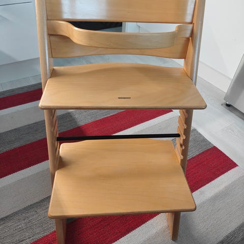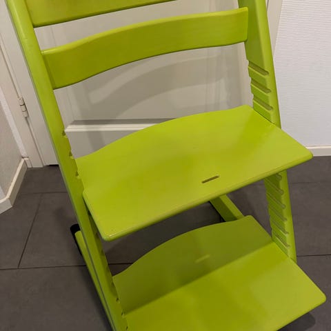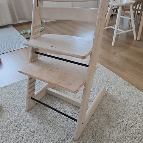 Kuultovalkoinen Stokken Tripp Trapp tuoli. Siisti, mutta maalipinnassa käytön jälkiä. Uudempaa mallia, johon sopii muovinen Babyset (ei sisälly mukaan).