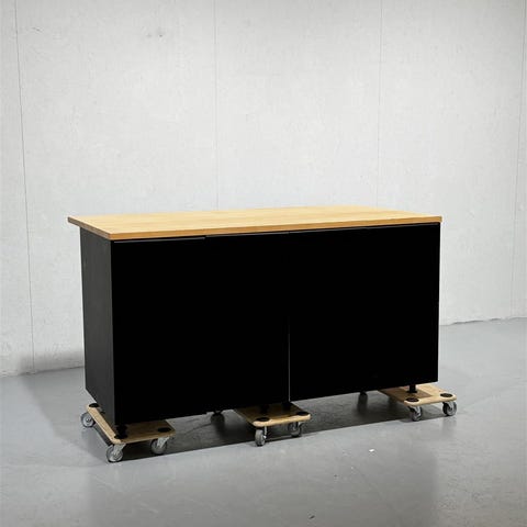 Keittiösaareke, jossa puutaso ja alakaapit, jossa on mustat ovet. Kaapeissa on neljä ovea ja sisällä hyllytaso. Taso menee kaappien "yli" takareunasta.Kuvattu rullien päällä, jotka eivät kuulu kauppaan. Tyyli on moderni ja yksinkertainen, sopii monenlaisiin sisustuksiin.