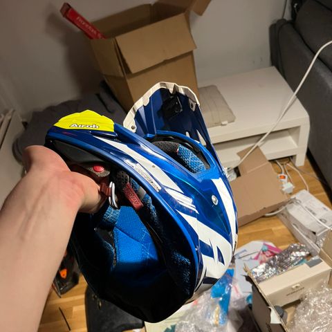Airoh motocross-kypärä M koko, jossa valkoinen ja musta graafinen kuosi. Kypärässä on pitkä lippa jossa lukee merkki "Airoh" avoin leukasuoja, jotka soveltuvat maastoajoon ja motocross-käyttöön. Ulkokuori on kovamuovia ja sisäpuolella on pehmustettu vuori. Soveltuu moottoripyörä- tai mopoenduro- ja motocross-ajoon.
