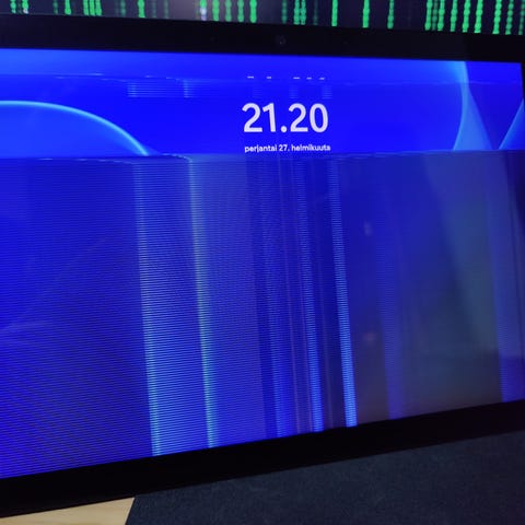Näytössä on hiushalkeama alareunasta ylös asti, jota ei edes huomaa jos ei tarkkaan katso. Kosketus toimii normaalisti eikä halkeama vaikuta käyttöön, mutta huomioitu hinnassa.