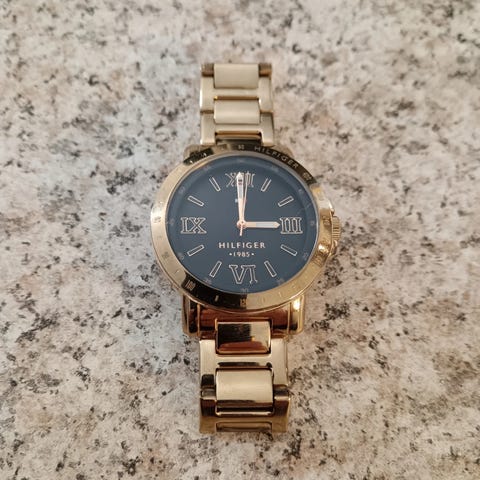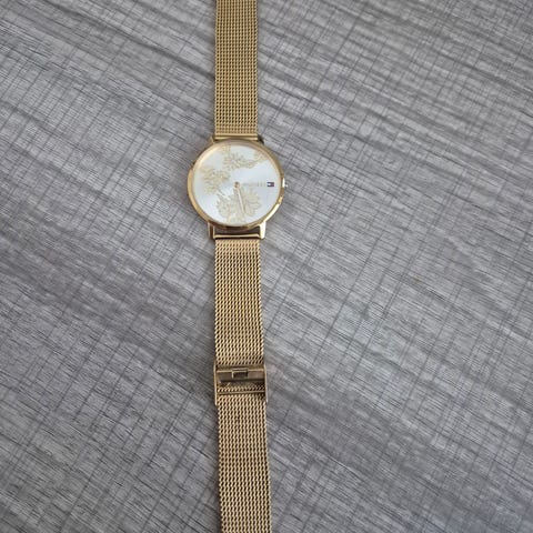 Myydään tyylikäs Tommy Hilfiger -naisten rannekello. Klassinen valkoinen kellotaulu kultaisilla yksityiskohdilla ja raikas vaaleansininen silikoniranneke – sopii arkeen ja juhlaan.