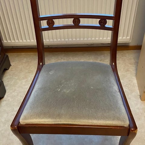 Myydään kovapuuta oleva tuoli. Ilmeisesti kyseessä on pyökkipuu, mutten ole varma. Tuoli on painava, tukeva, todella laadukasta työtä, mutta sen istuinosan kangaspäällyste on kärsinyt käytössä ja siinä on käytönjälkiä. Helposti kankaan voi vaihtaa uudeksi. Kunto olisi hyvä ilman tuota istuinosan käytönjälkiä, mutta sen vuoksi ilmoitan kunnon kohtalaiseksi.