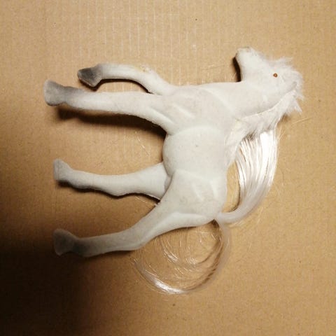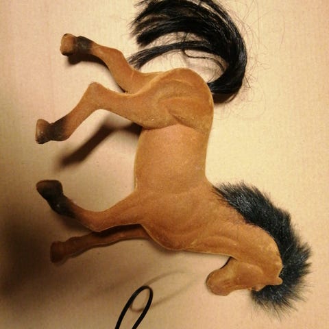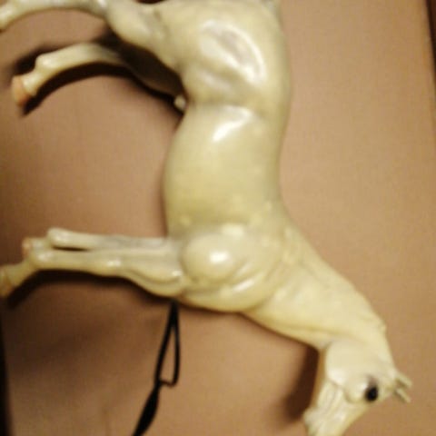 Hyväkuntoinen lasten leikki hevonen. Hevonen on samenttinen. Hevosen yksi valjas on irronnut, joka on korjattavissa liimalla jne.