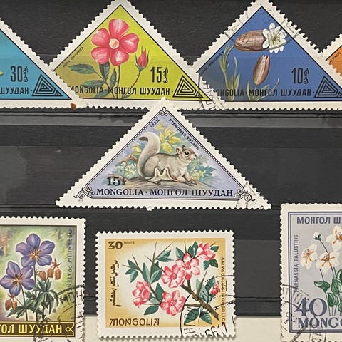 Postimerkkikokoelma, jossa useita eri maita, muun muassa Afrikan maita sekä Etelä Aasia.