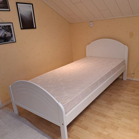 Yhden hengen sänky 90cm. Vanha mutta siisti ja ryhdikäs. Mukaan saa kaiken kuvassa näkyvän, jos haluaa eli Lakanat, tyyny,peitto,päiväpeitto,koristetyynyt,helmalakana,petauspatjan suoja.