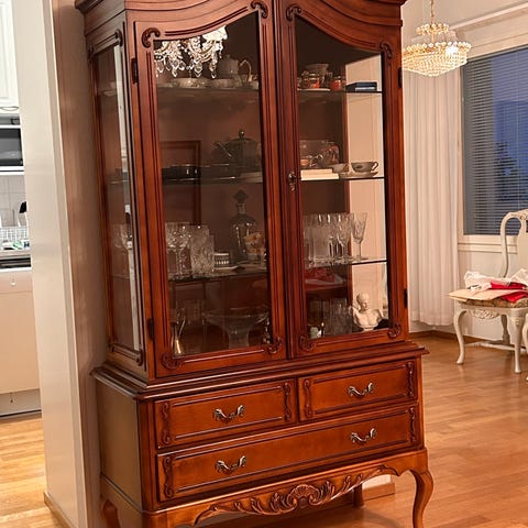 Puinen lipasto laatikoilla ja hyllyllä
