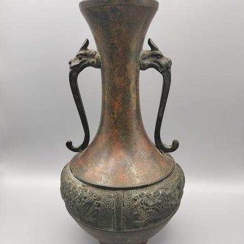 竹真斉 chikushinsaiThis elegant signed bamboo flower basket with original bamboo insert tube is attributed to Chikushinsai, a Japanese bamboo craftsman known for creating refined tea ceremony and ikebana utensils.The basket features an expressive openwork weaving technique combining dynamic diagonal bamboo strips with tightly constructed base plaiting. The form gently rises in an organic, undulating silhouette, demonstrating both structural integrity and artistic movement. The arched handle is firmly bound and balanced, adding vertical elegance suitable for tokonoma display.The included bamboo cylinder (otoshi) allows the basket to function as a flower container. The interior cross support structure provides stability for floral arrangements. The natural patina, subtle color variation, and aged bamboo texture enhance its wabi-inspired aesthetic, making it ideal for tea room display or contemporary interior settings.The artist’s signature “竹真斉” is present, confirming authorship.A refined and collectible example of Japanese bamboo artistry suitable for both traditional and modern spaces.⸻SizeHeight: 33 cmWidth: 22 cmDepth: 20.5 cm⸻Weight403 g / 0.403 kg⸻ConditionGood vintage condition with natural aging, patina, and minor surface wear consistent with age. No structural damage observed.⸻Artist ProfileChikushinsai was a Japanese bamboo crafts artist known for producing tea ceremony and ikebana baskets. His works are typically signed “竹真斉” and reflect traditional forms such as Sōzen-style baskets used in tea settings. His craftsmanship emphasizes natural bamboo texture, balanced structure, and refined aesthetic sensibility rooted in Japanese tea culture.