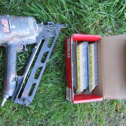 Todella vähän käytetty paineilmalla toimiva tehokas runkonaulain ja säilytyskotelo. Yksi autokatos rakennettu ja nyt tarpeettomana pölyttymässä. Pois tilaa viemästä.