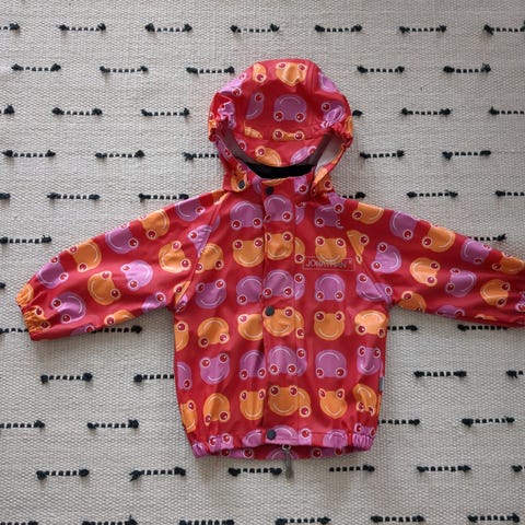 Myydään sadetakki ja housut leopardikuviolla.