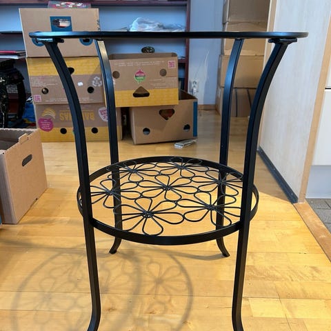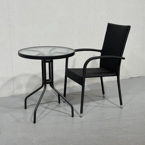 Pyöreä sivupöytä, jossa on lasikansi ja valkoinen polyrottinkirunko. Pöydässä on punottu reunus ja ristikkomaiset jalat. Sopii esimerkiksi olohuoneen sivupöydäksi, yöpöydäksi tai pienenä sohvapöytänä. Pöytä on tarkoitettu sisä tai ulkokäyttöön.