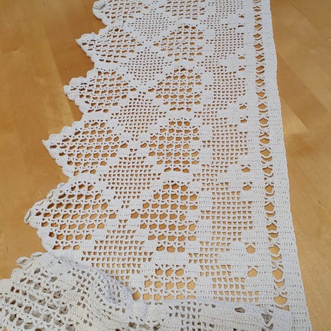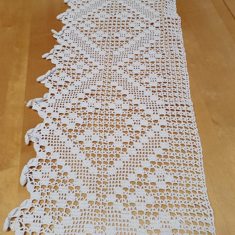 Myydään kalalangasta virkattu verhokappa.