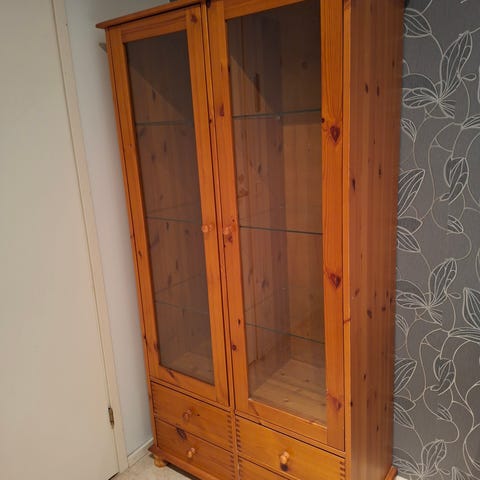 VARATTU: Tamminen vitriinikaappi lasiovilla