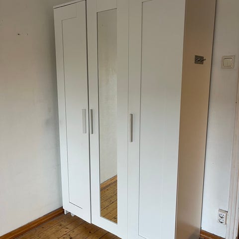 Kolmeovinen Ikea Brimnes valkoinen vaatekaappi, jossa on peili oikeanpuoleisessa ovessa. Sisällä on vaatetanko ja hylly. Kaappi edustaa modernia tyyliä, joka sopii monenlaisiin sisustuksiin. Peili lisää käytännöllisyyttä ja tilan tuntua.
