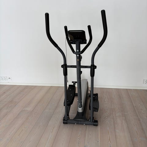 Kuntopyörä crosstrainer sisäliikuntaan. Laitteessa on käsikahvat, jalkatasot ja etuosassa näyttö, josta voi seurata harjoittelun perusarvoja (esim. aika ja mahdollisesti matka tai arvioitu kalorinkulutus). Väri on musta, ja laite soveltuu kotikäyttöön koko kehon harjoitteluun. Materiaali on pääosin metallia ja muovia.