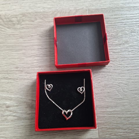 Myydään käyttämättömät hopeiset kultasepänliikkeestä ostettu korusetti. Setti sisältää kaulakorun ja korvikset lahjapakkauksessa.
