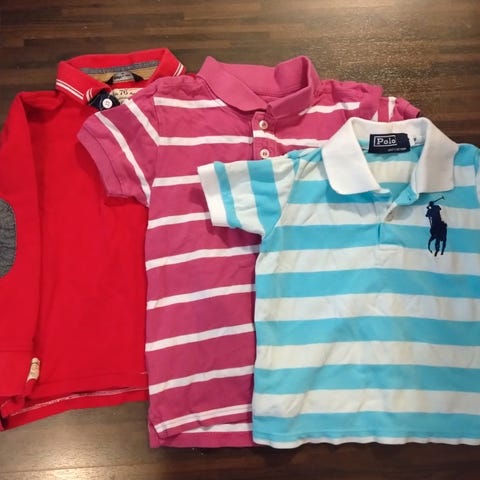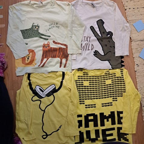 Neljä kappaletta Lindexin pitkähihaisia paitoja koossa 110cm. Mielestäni pienehköä mitoitusta ja käytettiin meillä koon 104-110cm vaatteita käyttävällä lapsella.