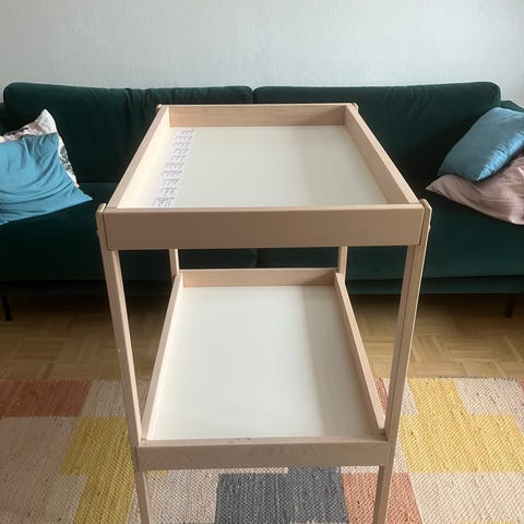 Ikea hoitopöytä, jossa valkoinen runko ja kaksi vihreää vetolaatikkoa. Hoitotaso ylhäällä korotetuilla reunoilla. Alhaalla kaksi avointa hyllyä ja kaksi laatikkoa tarvikkeiden säilytykseen. Soveltuu vauvan hoitoon ja lastenhuoneen säilytyskalusteeksi.