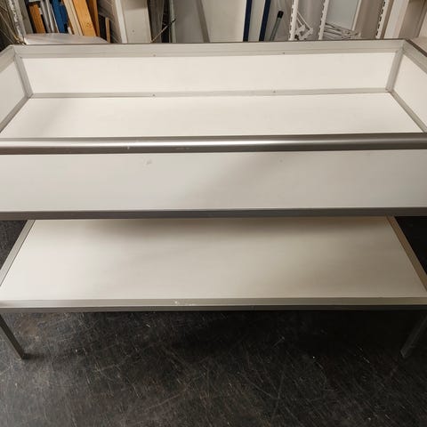 Myymälälaari, jonka korkeutta pystyy säätämään. Näihin laareihin saat näyttävästi massana esille tuotteesi. Hieman valkoinen väri on rapistunut, mutta muuten ehjät.