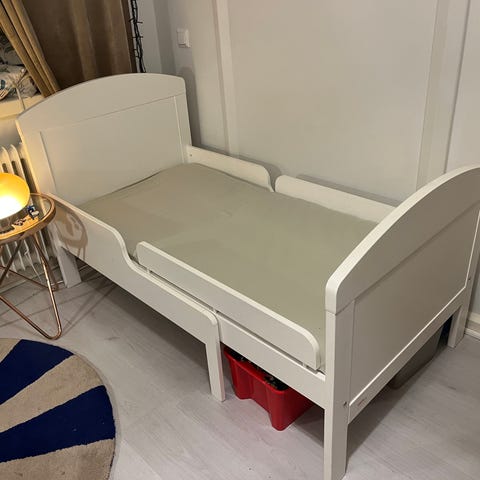 Myyntiin tanskalainen klassikkosänky Sebra Junior & Grow. Tämän valkoisen jatkettavan lastensängyn pituutta voidaan säätää lapsen kasvaessa ja sen saa kasvatettua aikuisellekin sopiviin mittoihin.