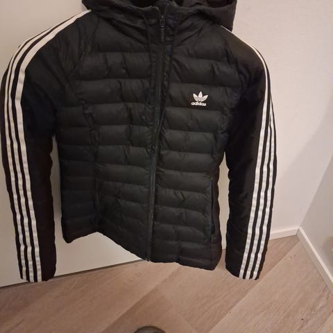 Adidas naisten takki, koko M. Musta ulkotakki, jossa keskipitkähkö malli ja huppu. Takissa on edessä vetoketju ja painonapit, sekä sivutaskut. Hihoissa on Adidasin tunnusomaiset raidat ja edessä pieni logo, selässä suuri Adidas-trefoil-logo. Sisävuori on kirkkaan oranssi, topattu ja lämpöä eristävä. Soveltuu arjen ulkoiluun ja vapaa-aikaan viileämmillä keleillä. Vetoketjussa pientä kulumaa ja sisävuoressa kangas hieman tummunut muuten moitteeton kunto.